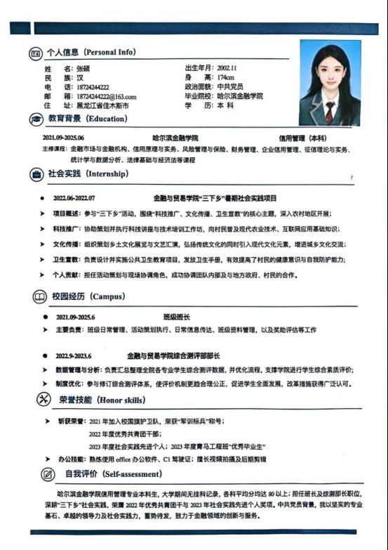 同学们将自己的学习成果、实践经验、个人技能等方面的内容巧妙地融入到简历当中,展现出了大学生朝气蓬勃的精神面貌和当代青年的职业新人形象。