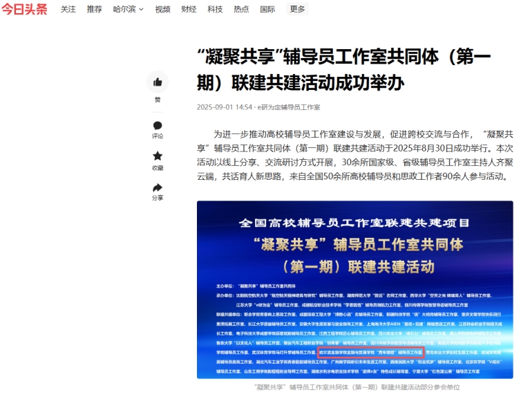 我院 “青年理想” 辅导员工作室成功入选第四批高校辅导员工作室 “联建共建” 名单,这不仅为我院新生代辅导员工作室搭建起重要的联建起点,更标志着其建设发展迈入新阶段。2025 年 8 月 30 日,工作室以联建共建单位身份,积极参与由 “凝聚共享” 辅导员工作室共同体主办的(第一期)联建共建活动,相关动态已在今日头条平台专题报道,进一步扩大了工作室的育人影响力与行业交流覆盖面。