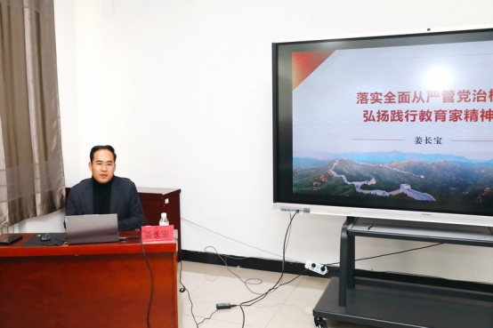 为深入学习宣传党的二十届四中全会精神,贯彻习近平总书记关于教育的重要论述,11月5日,校纪委书记姜长宝以“落实全面从严治党要求 弘扬践行教育家精神”为主题,为金融与贸易学院全体教师讲授专题党课。党课由金融与贸易学院党总支书记高丽菊主持。