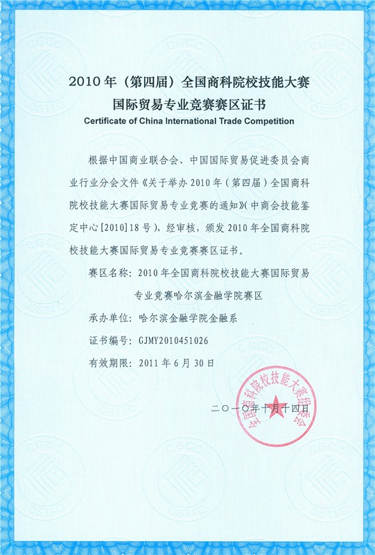 我校金融系被“全国商科院校技能大赛国际贸易专业竞赛”组委会授权建立哈尔滨金融学院赛区,组织“全国商科院校技能大赛国际贸易专业竞赛”组织知识赛以及技能赛的初赛工作,选拨优秀队伍参加全国总决赛。