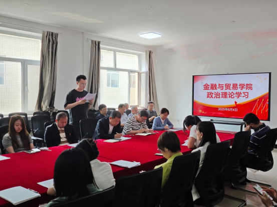 2025年6月4日,金融与贸易学院党总支按照党委统一安排部署,精心筹划,结合金融与贸易学院实际工作在会计楼220开展政治理论学习,此次学习由党总支书记高丽菊主持召开,金融与贸易学院全体教师参加。