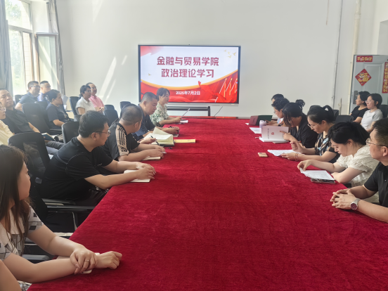 2025年7月2日,金融与贸易学院党总支按照党委统一安排部署,精心筹划,结合金融与贸易学院实际工作在会计楼220开展政治理论学习,此次学习由党总支书记高丽菊主持召开,金融与贸易学院全体教师参加。