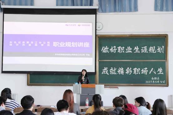 2023年5月10日下午,东北证券股份有限公司黑龙江分公司总经理李锐来到金融系,为即将步入求职阶段的大三年级学生进行大学生职业生涯规划指导讲座,引导学生树立正确的就业观,做好职业生涯规划,会议由党总支副书记高丽菊主持。